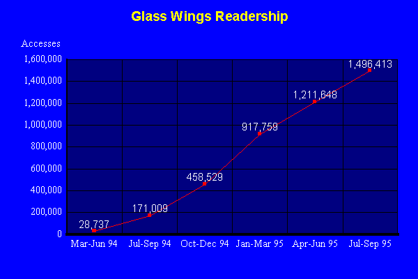 Glass Wings exists to publish and distribute selected art and literature online. We are particularly interested in material of a positive and joyous nature and are exploring ways in which computer technology can be effectively used to support the process and expand the possibilities for creating art and literature. We seek to make our material available globally and continuously for posterity.