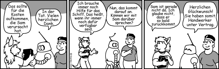 Original FREEFALL gezeichnet von © Mark Stanley, Farbe von © Michael Menne, deutsche Übersetzung © Markus Pristovsek, ab Strip 325 © Michael Lorenz und © Bernhard Lindner, ab Strip 445 © Markus Pompejus. Grafische Bearbeitung: © Susanne Simon. Ab Strip 539 © Sebastian Vogt.
