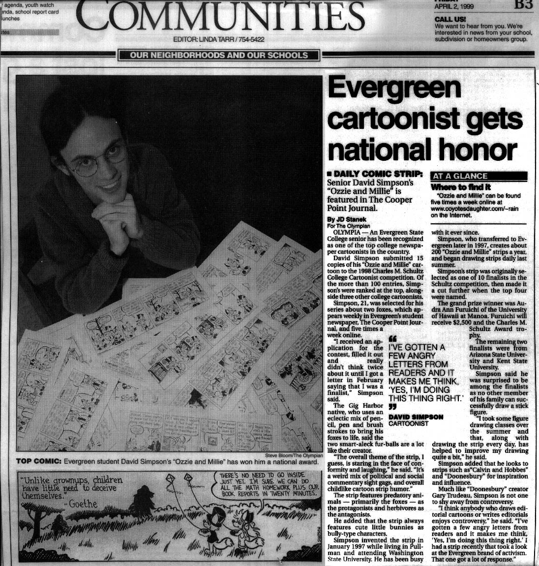 Interview from The Olympian, April 2, 1999. I was a senior in college when Olympia's major (well, sort of) newspaper sent an intern to interview me. The quotes are sort of paraphrases of what I actually said, and the author, J.D. Stanek, actually managed to misspell the name of my strip, but it's generally accurate otherwise. Also I like the photo they took.