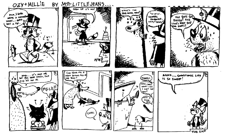 Jason Miles's strip. When Jason first saw my work, he thought "man, what a corporate-looking strip." When I first saw his, I thought "what drugs is he taking? Are they fun ones?" However, the fact that we both take comics very seriously made it inevitable that we'd end up as friends. WARNING: Jason's "Ozy and Millie" is not for the faint of heart. You have been warned. (Can you identify the strip from which the art in the last panel is taken?)