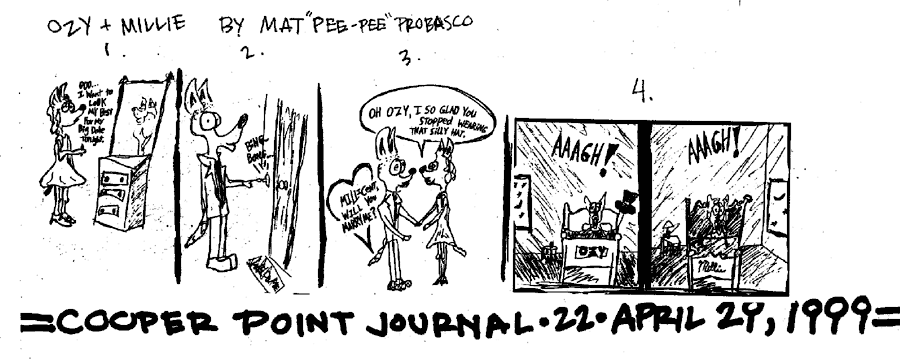 In a roundabout way, it started when Mat Probasco and I toyed with the idea of drawing each other's strips, much as Bill Holbrook and I had on April1. Mat, the editor-in-chief as well as the author of a pleasantly surreal strip called "Me As A...," and Jason Miles, the comics editor and author of the equally surreal "The," talked to some of the other artists about it...apparently they all wanted to draw "Ozy and Millie."