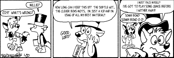 Ozy & Millie, and everything related, © 1997-1999 D.C. Simpson. Feel free to do stuff with these images. But remember, they belong to me! And please resist the urge to harm them because of it!