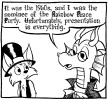 Llewellyn Voller Name lautet wirklich nur Llewellyn (reicht ja auch aus). Vorher meistens als "DragonDad" oder "Ozys Vater" bekannt. Ein großer roter Drache, der einen kleinen Fuchsjungen adoptiert hat und ihn nun großzieht. Es wurde bereits angedeutet, daß er schon ziemlich viel erlebt hat, zumindest einige hundert Jahre alt ist, und hat viele der geschichtlich bedeutenden Ereignisse selbst miterlebt. Hinter seinem zerstreutem Gehabe verbirgt sich ein gerütteltes Maß an Weisheit. |