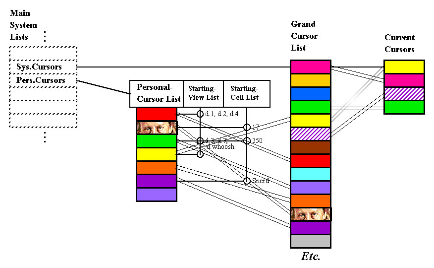 Date: Thu, 06 Jul 2000 03:30:07 +0900 To: lukka@xxxxxx, veparkki@xxxxxxxxxxxxx From: Ted Nelson <ted@xxxxxxxxxx> Subject: :zz,virt: Cursor-switching command specs (d5 Cc: ted@xxxxxxxxxx, marlene@xxxxxxxxxx, xanni@xxxxxxxxxx, eharter@xxxxxxxxx Hi guys-- The family of cursor-switching commands lets the user open separate cursor-windows, switch views among these windows, and switch arrowset assignments among them. Dimension views and starting cells may be preset or not, as the user prefers. Note that a standard PC keyboard gives you a separate arrowset for moving two to four cursors simultaneously; this adds some complication to the model. (If you had only ONE arrowset, you would merely switch it among windows.) ORIGINAL SPECS The cursor-switching commands in the original '97 specs-- in fact, I think in the '86 specs-- were: ? cursor fork (make new cursor in new window on the same accursed cell that you're looking at). ? cursor vaporize (formerly "cursor kill"-- unpleasant term), closes the window/cursor you're presently looking at and transfers frontness to one of the remaining cursors which remain-- the next on the Current Cursors looplist. ? cursor leap or switch (formerly cursor hop)-- bring a different current cursor to the front. How to use these is self-evident. However, this simple model assumed that you have-- ? no preferred cursor preset views and starting positions ? only one arrowset Various complications ensue from these additional options. I'll deal with them in the design that follows. Let's start with Cursor Presets: ? You may want a cursor with a specific view, all set up ? You may want a cursor on a specific starting cell Then we'll get to switching arrowsets. Here's my new fuller design. ================ Refer to picture. Note that clones are indicated with thin double lines. The user is assumed to have a current cursor set of cursors working (one or more), each with its own window open. Cursors do not have names, except to the system. (Actually we *might* have them later...) A cursor has a color or picture. This can be a JPEG or .gif, which appears behind the contents. We have THREE CORNER LISTS OF CURSORS (in d.1/d.2); as with dimensions, each of these is a ringrank-- ? one for the system list of all cursors-- The Grand Cursor List (the system list) is just a list of preset cursor appearances (you see the appearances on the list-- i.e., cells with colors and/or patterns). ? one for the system list of cursors presently open. ? The Personal-Cursor List is a list of clones from the Grand Cursor List, listing the subset that you want to be able to open quickly. (This also seems to be the way dimensions currently work.) There are also TWO CORNER LISTS THAT FURTHER SPECIFY HOW CURSORS OPEN-- ? The Starting-View List in d.2 gives the dimensional views preassigned to a cursor. (I presume through some cell, but I still don't understand your "viewspecs"). Note that if no starting view is specified, the cursor opens showing dimensions 1-2-3. ? The Starting-Cell List in d.2 tells where a cursor should start when fired up-- that is, which cell it should accurse. Each cursor on your Personal-Cursor list MAY OR MAY NOT be connected in d.1 to a starting-view and/or a starting-cell (see pic). EXAMPLE. You have a red cursor which opens on d.1, d.2 and d.4. We see from the picture that ? the red cursor shows in the Personal-Cursor list; ? it connects in d.1 to the starting-view list, where d.1, d2, d.4 are specified. EXAMPLE 2. Another of your personal cursors is green and opens up in d.3, d.7 and d.whoosh, at cell 350. We see that ? the green cursor shows on the Personal-Cursor list, ? it connects on d.1 to dimensions on the Starting-View list, specifying d.3, d.7 and d.whoosh. ? it further connects on d.1 to a clone of 350 (it can't be 350 itself, unless you aren't otherwise using 350 in d.1), on the Starting-Cell List THE COMMANDS ===================== We begin with the simplest. CURSOR VAPORIZE [Alt-V?] This closes the front cursor-window. The next cursor to be in front is the next on the Current Cursor List. CURSOR FORK Okay, now suppose you're cruising along in our current mode with a green and purple cursor. You invoke a Cursor Fork [prob. Alt-F--] and you then automatically see the NEXT UNUSED CURSOR ON YOUR PERSONAL-CURSOR LIST WHICH DOES NOT HAVE A PREFERRED STARTING POINT. (Why? Because you did a "cursor fork", meaning (since the cursor will appear on the same accursed cell you were looking at) that you want to go through the list of cursors whose starting points are not assigned-- to begin with.) SELECTION OF CURSOR You indicate that the cursor that appears is the cursor you want by moving that cursor. Suggested sequence: If that cursor is not the one you want, you use TAB to step through the other cursors on your personal-cursor list. These should go first through the cursors which have no assigned starting point, but then if you don't choose any the first time through, it goes through all your personal cursors; and if you don't choose any of those, it goes through the system cursors. (I actually prefer the space bar, but the logic would probably scare you at this point :) NEW CURSOR "New cursor" [maybe Alt-C] indicates that you want a NEW cursor, not one which opens on a presently-accursed cell, but on another cell; so the system supplies the first unopen cursor that has an ASSIGNED cell to start on (from the Starting-Cell List). Tab through those till you get to the cursor you want, then select that cursor by moving it. If you go through the whole Starting-Cell list without accepting a cursor, we then loop through all the other unopened cursors. SWITCHING CURSORS "Switch cursors" can actually can mean two things-- ? switch cursor/window that's at front and sometimes ? reassign arrowset. (This "reassign arrowset" is the most annoying part.) Basic concept: for simplicity's sake, Window Frontness DOES NOT CHANGE AS YOU MOVE YOUR CURSORS. We leave it to your arrangement of the 